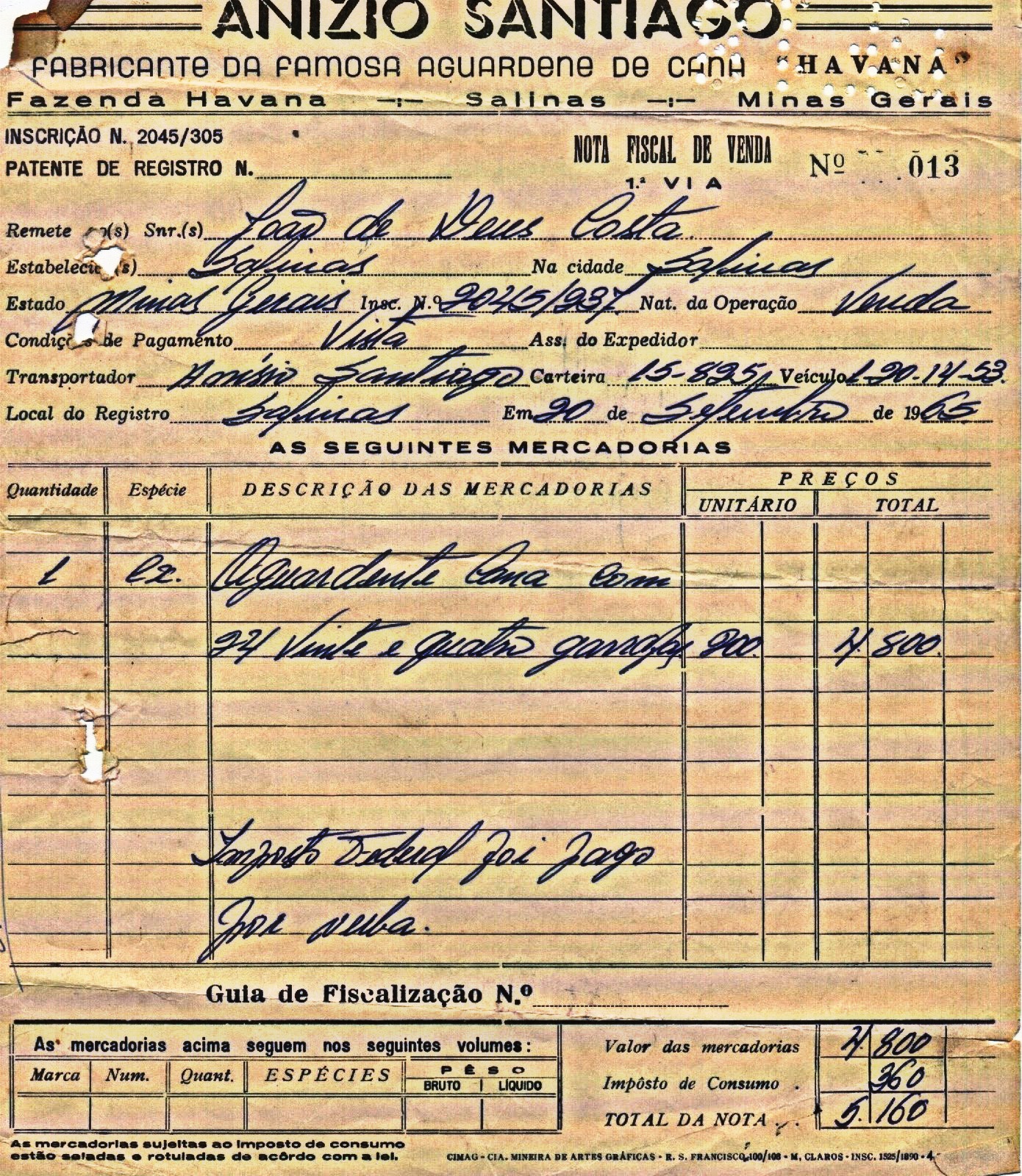 Relíquia histórica: nota fiscal do produtor da cachaça Havana, emitida no dia 20 de setembro de 1965. Anísio Santiago foi o primeiro produtor de cachaça a legalizar seu alambique com a marca Havana em 1946, final da primeira metade do século XX. O destinatário da nota Fiscal é João de Deus Costa (1928-2009), empresário na época e maior historiador de Salinas.